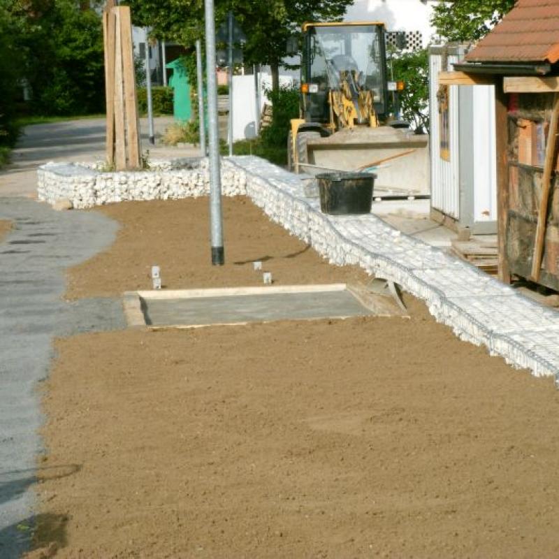 In einer mehrtägigen Marathonaktion der Mitglieder des Gemeinderates, der Parteien und der Bevölkerung wurde die unansehnliche Mauer mit einer Gabionenwand verkleidet die nun perfekt in die Umgebung passt.